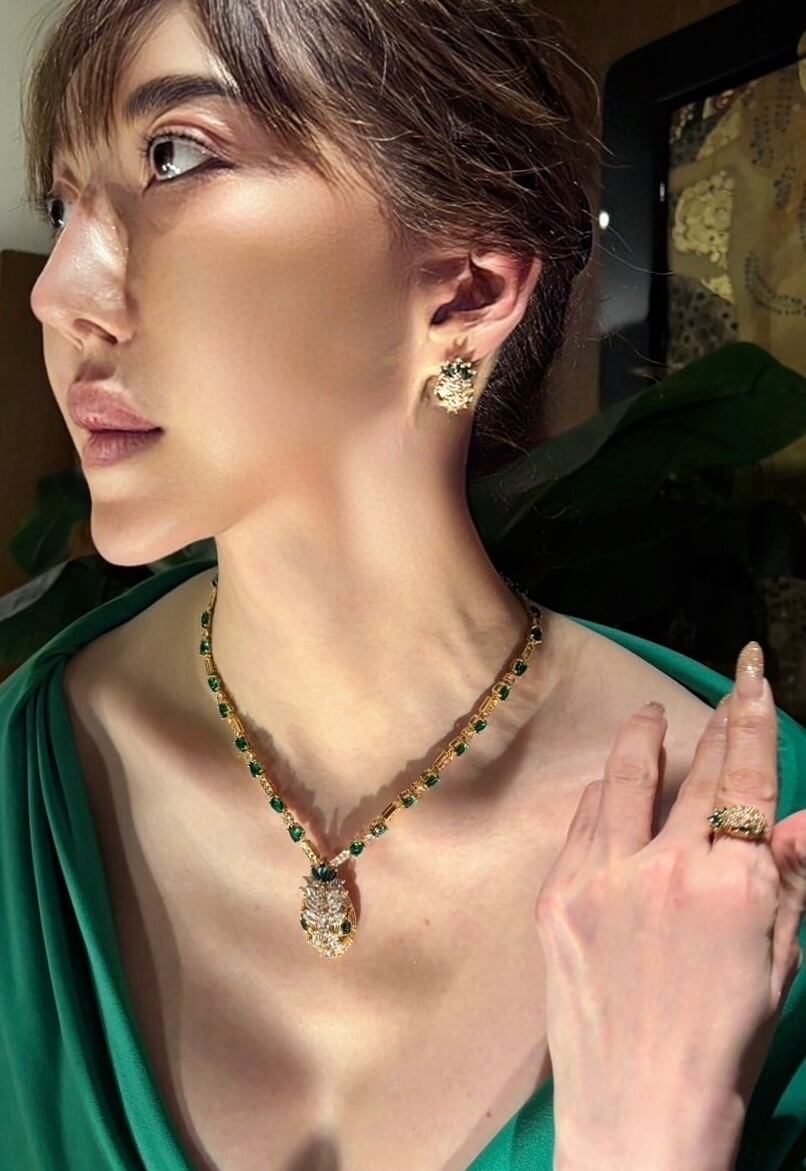 エメラルドカラーの輝きが、華やかさを添えてパーティや特別なシーンにぴったりです。